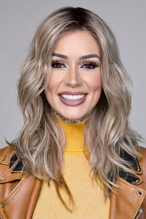 Belle-TressCOLOUR SHOWN: CRUSHED ALMOND BLONDE ROOTED (Model) SPECIFICATIONS: HAIR FIBRE: Heat Friendly Synthetic CAP: Extended Created Lace Front, Left Mon...