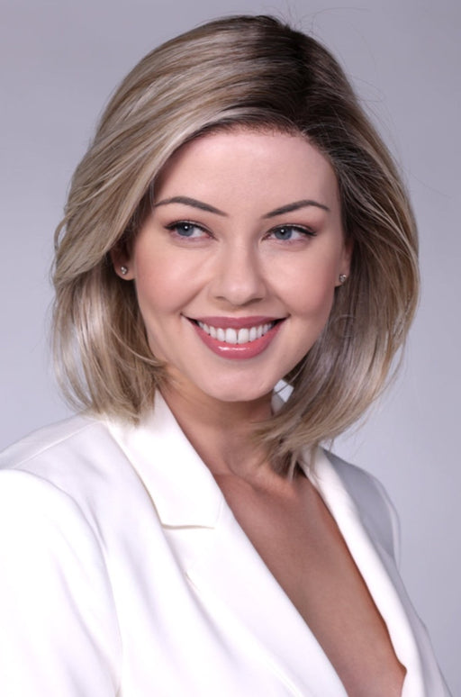 Belle-TressCOLOUR SHOWN: CRUSHED ALMOND BLONDE ROOTED (Model) SPECIFICATIONS: HAIR FIBRE: Heat Friendly Synthetic CAP: Extended Created Lace Front, Left Mon...